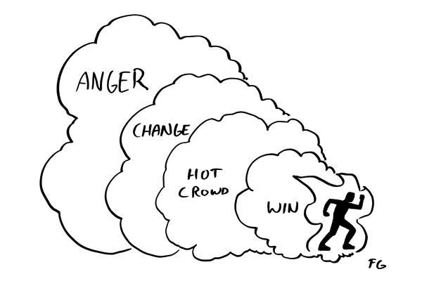 WHERE IS FIRE? LOOK FOR ANGER. MIDDLE OF ANGER IS CHANGE. MIDDLE OF CHANGE IS HOT CROWD. MIDDLE OF HOT CROWD IS WIN. MIDDLE OF WIN IS FIRE.