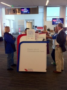 I show up at Virgin and notice that they have a Chromebook kiosk. Neat – there’s a bunch of computers that are connected that anyone can use while waiting for the flight. Then I realize they are giving away free Chromebooks to use on the flight. You only get to use them during the flight, but they are free and include a free WiFi connection. Double neat. Then I sit down, open up my MacBook, and immediately see my Skype WiFi app pop up and tell me I can connect to WiFi for $0.10 / minute. Since I don’t have a Boingo subscription, and there’s not any other obvious free WiFi right here, I just click yes. Oh – and there’s a nice desk area and power.