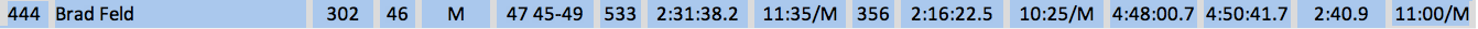 I went through the first half in 2:31:38 right on target. I felt really strong and decided to just keep cruising to mile 18 and then open it up and see what I had left. Mile 17 was 11:34 and then the following miles were 10:19, 10:06, 9:57, 9:58, 10:11, 10:21, 10:02, 10:08, 9:14 with a 7:54 for the last 0.2. Eight of the last nine miles used an 8:2 pattern (I ran the last 1.2 without a walk break) so the times are even more powerful since my running pace during these segments was often sub 9 minute miles, which is very fast for me.