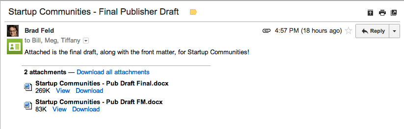 Yesterday at 4:57pm I hit send in Gmail and submitted the final draft of my newest book Startup Communities: Building an Entrepreneur Ecosystem In Your City to my publisher (Wiley). I’ve still got two more revision cycles – one in a few weeks when I get the final copyedited version and then one last review of the page proofs but the book is done. The publication date is early October but if history is a guide it should be out by mid-September.