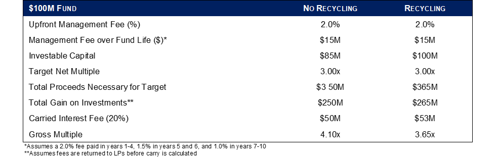The fund that chooses to recycle fees requires a 3.65x gross multiple to achieve a 3.00x net multiple, whereas the fund that does not recycle proceeds to offset management fees requires a 4.10x gross multiple to achieve a 3.00x target net multiple. As long as re-invested capital is prudently deployed into opportunities capable of generating strong results, recycling is an impactful way for GPs to increase net returns, which ultimately benefits investors and themselves.