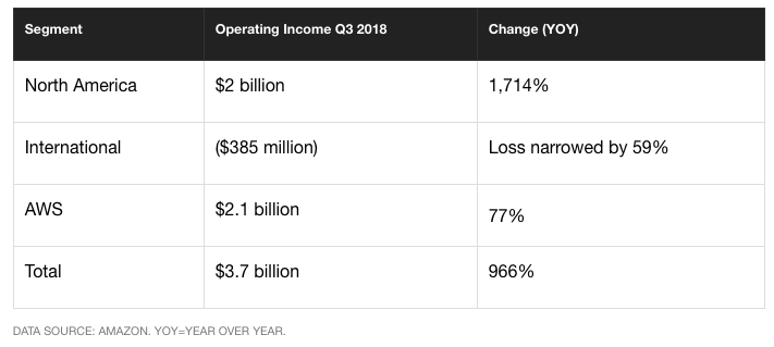While growth in revenue is still important, Amazon’s ability to generate this kind of growth on its operating income is a reminder that turning on the profit switch at some point does matter, if only to show how much leverage your operating model has (me thinks Tesla did that in Q318 for the same reason). The AWS numbers are remarkable to me – their YOY growth is 46% and their operating income is about 30%. That’s well above the rule of 40.