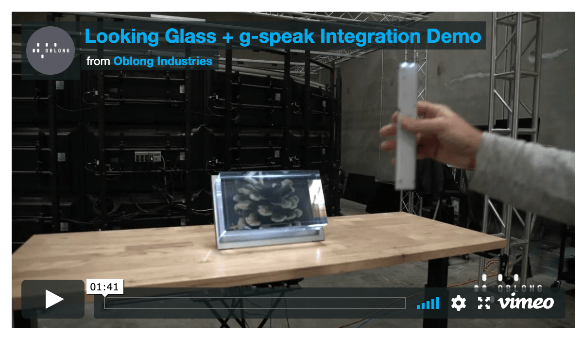 Oblong is a master of spatially interacting with 3D data on a 2D display . Looking Glass lets you interact with 3D data in a 3D display with their product (the Looking Glass .)