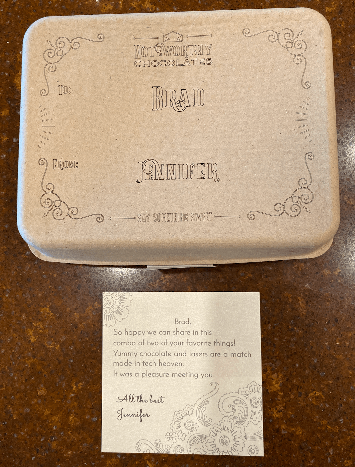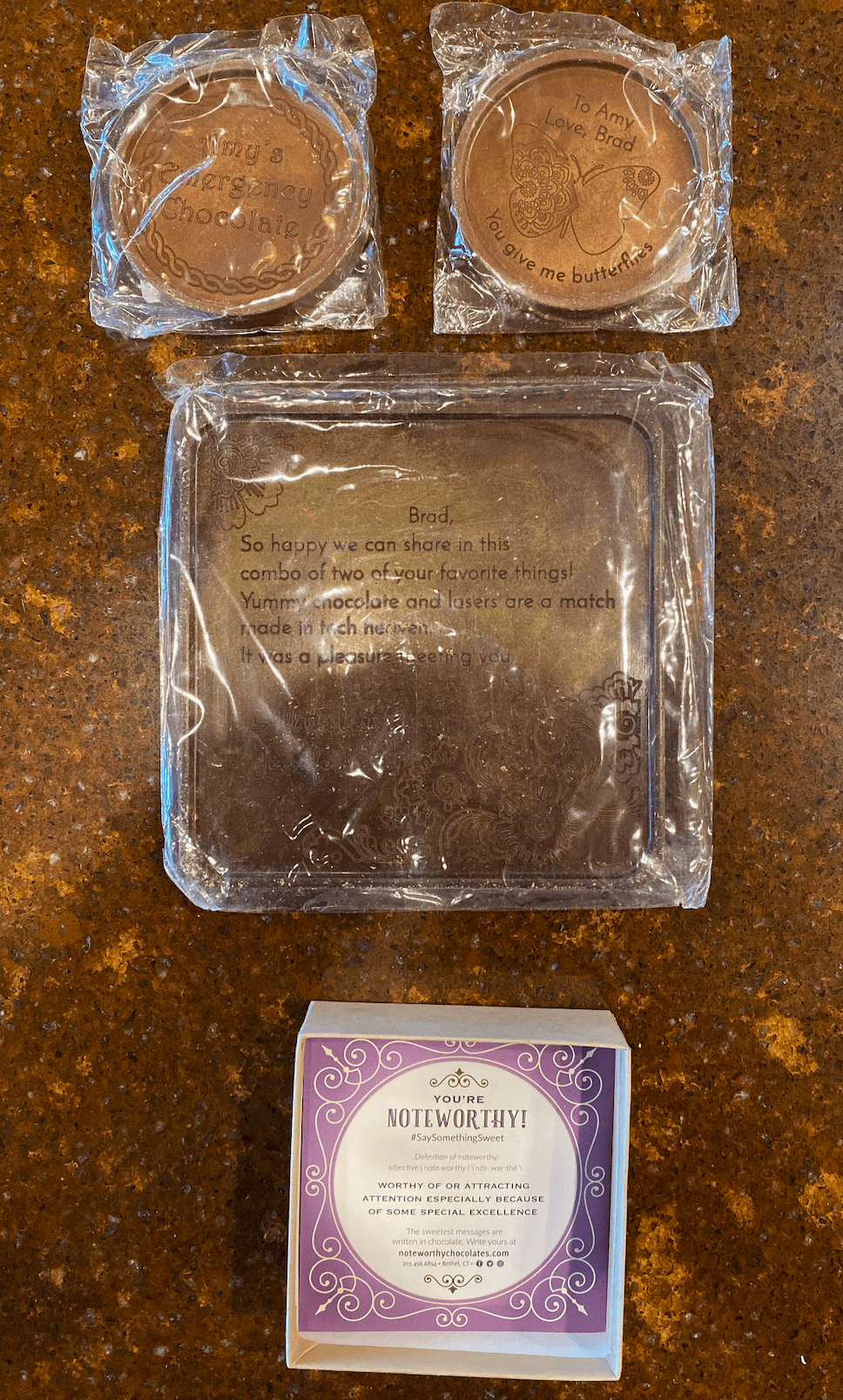 I love chocolate. I love lasers. So it would be logical that I’d love chocolates that are engraved with personalized messages with lasers .