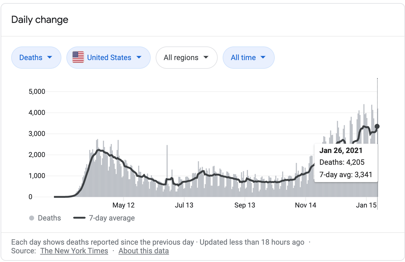 Or, consider all of the messages you heard about the severity of the disease over the past year. Most of the messaging, until recently, was not “79,000 people in the US are going to die of Covid in the first 26 days of 2021.”
